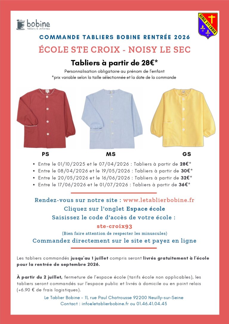 Les élèves de la classe de Petite Section à la Grande Section sont tous tenus de porter une blouse. Pour bénéficier du tarif négocié et des frais de livraison offerts (livraison à l’école), la blouse doit être commandée avant le 30 juin.